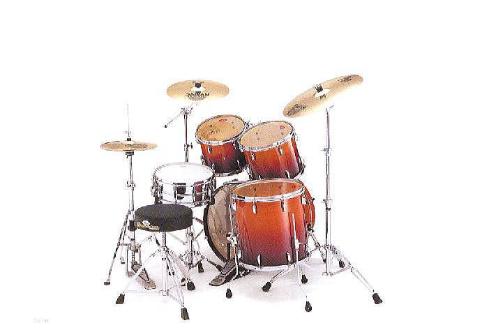 ハイハットシンバル:ドラムセットのなかでも、異彩を放っているのがこれ。2つのシンバルをあわせて音をだします。足で2つの間の開き具合をコントロールしながら、叩きます。閉じた時の音や、少し開き気味のときの音(ハーフオープン)、開いた時の音、カップと呼ばれる部分の音などなど、実に様々な音を出す事ができます。手でも叩きますが、足だけでも音を出す事ができます。ハイハットシンバルを表している譜面の中に、小さな丸しるし(。)がありますが、これは主にハイハットをハーフオープンで開くというしるしです。また、五線譜の一番したにある音符は足だけで音を出す時の音符です。